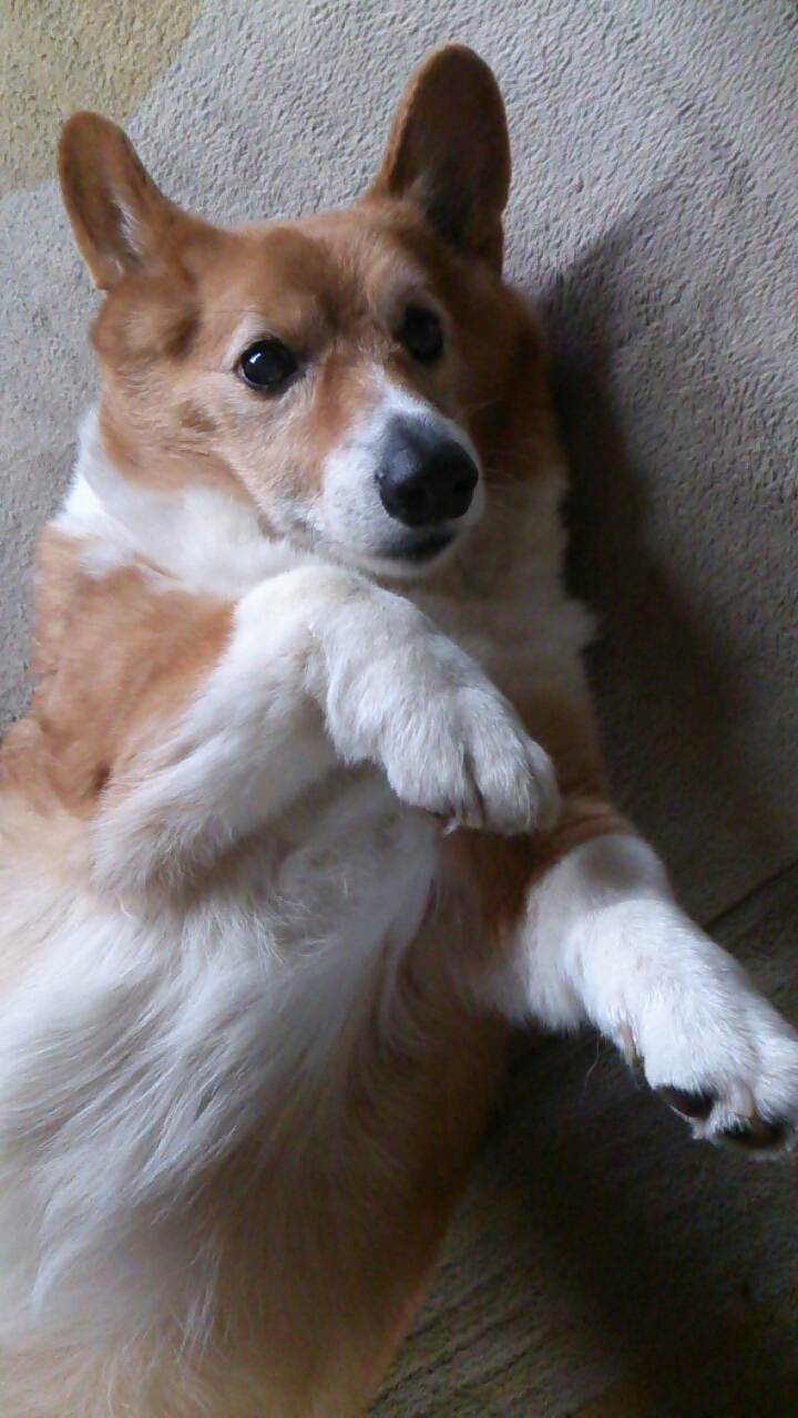 ケンシロウの構えのようなポーズで寝っ転がる犬さん。